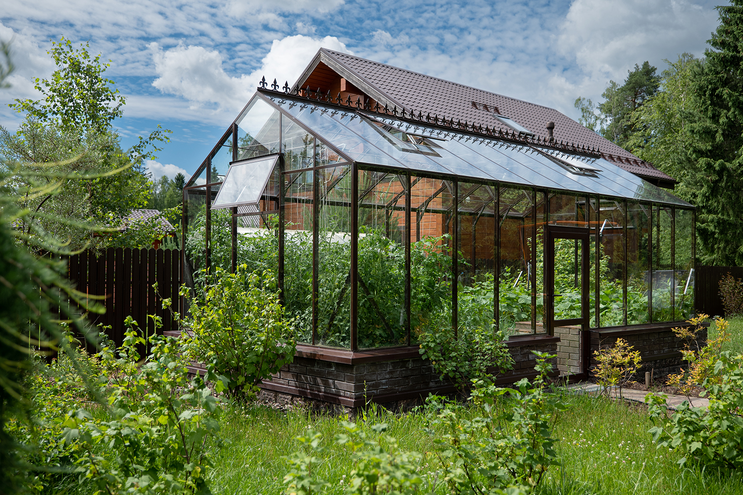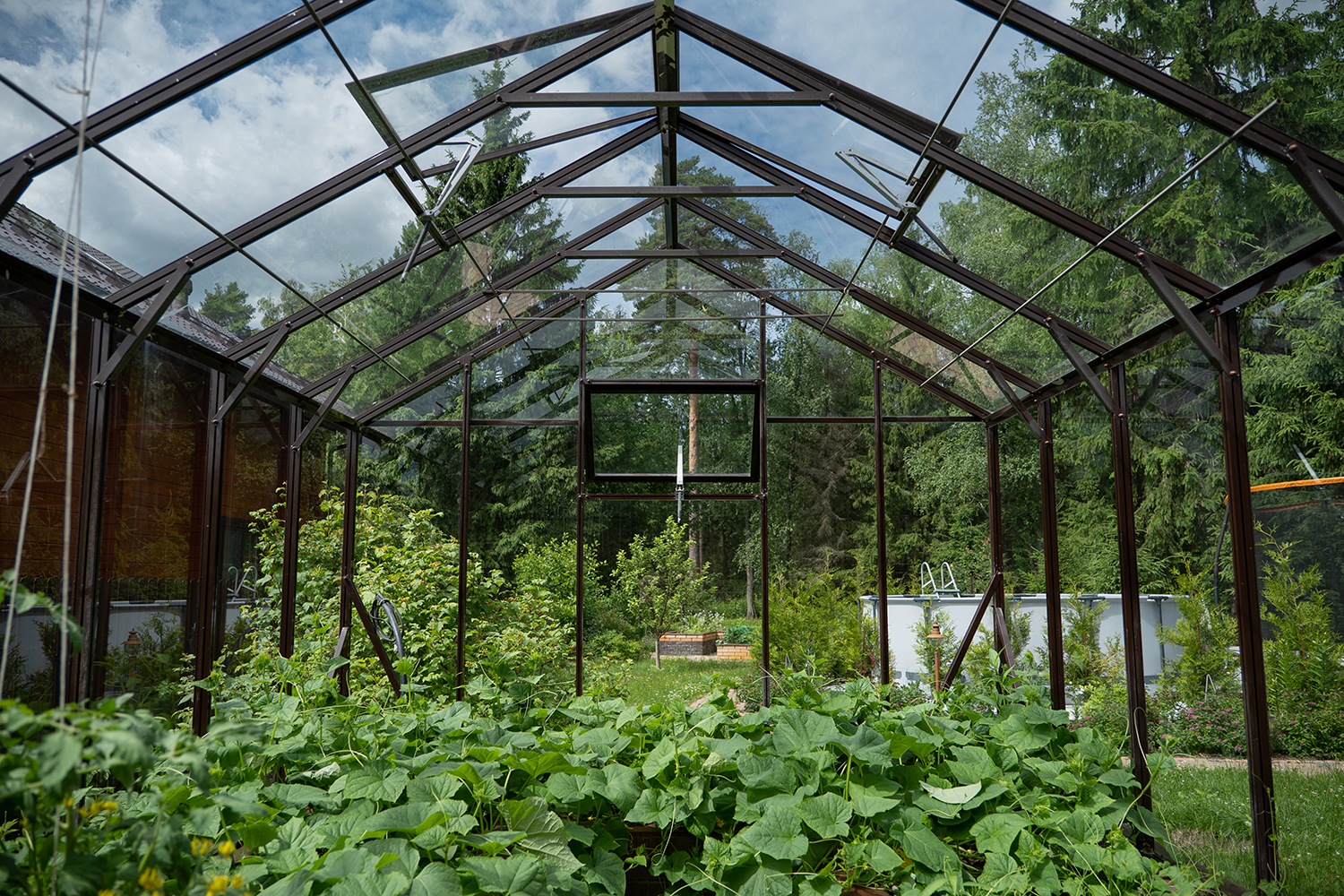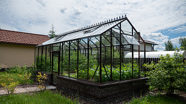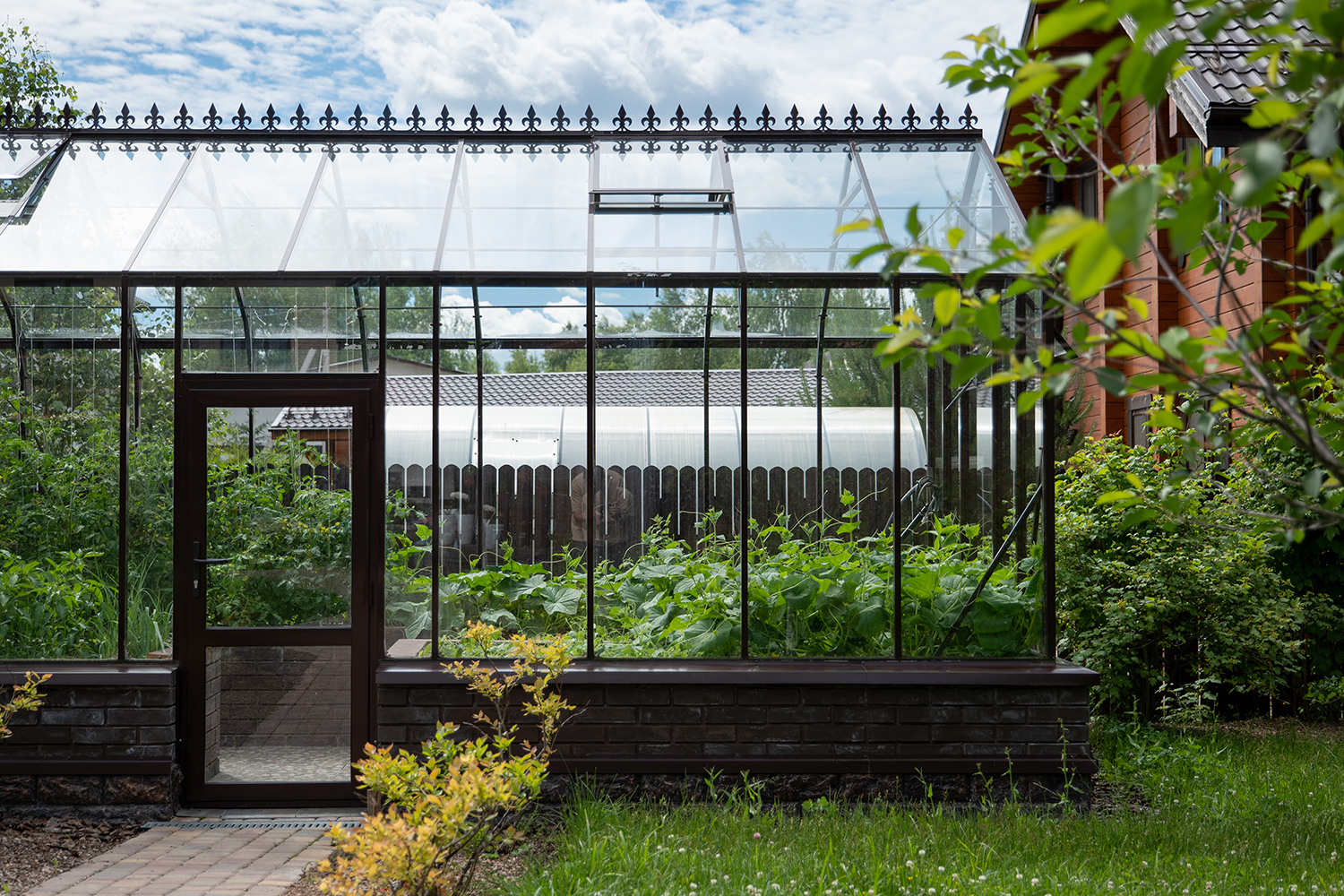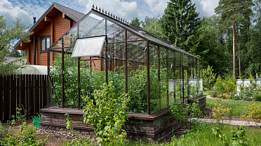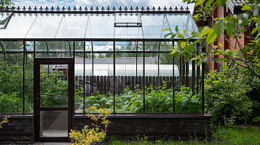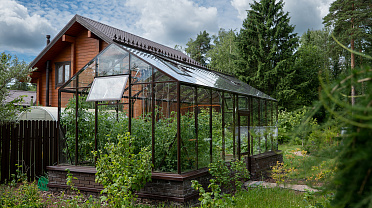 Боковое размещение входа формирует более гибкую планировку и удобную логику использования пространства. Такое решение упрощает зонирование внутри и делает перемещение более естественным, позволяя органично вписать теплицу в участок и создать продуманную и комфортную рабочую среду.