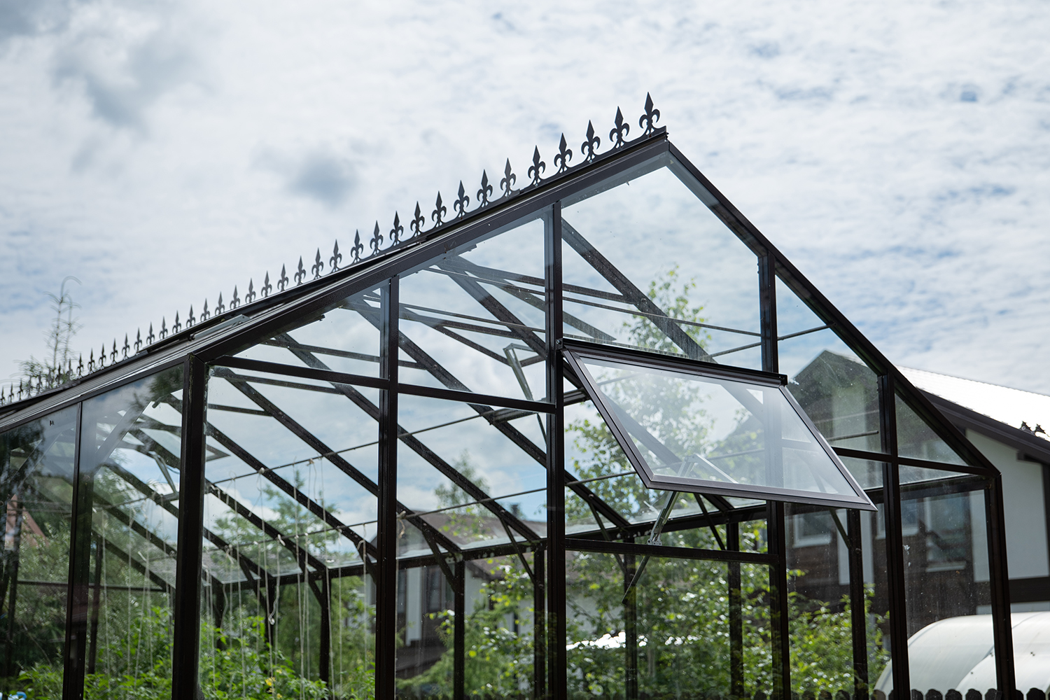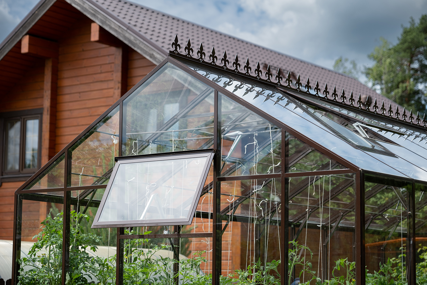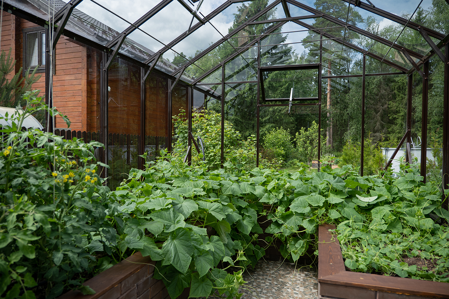 Боковое размещение входа формирует более гибкую планировку и удобную логику использования пространства. Такое решение упрощает зонирование внутри и делает перемещение более естественным, позволяя органично вписать теплицу в участок и создать продуманную и комфортную рабочую среду.