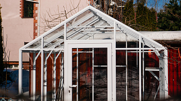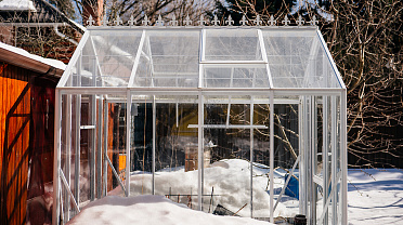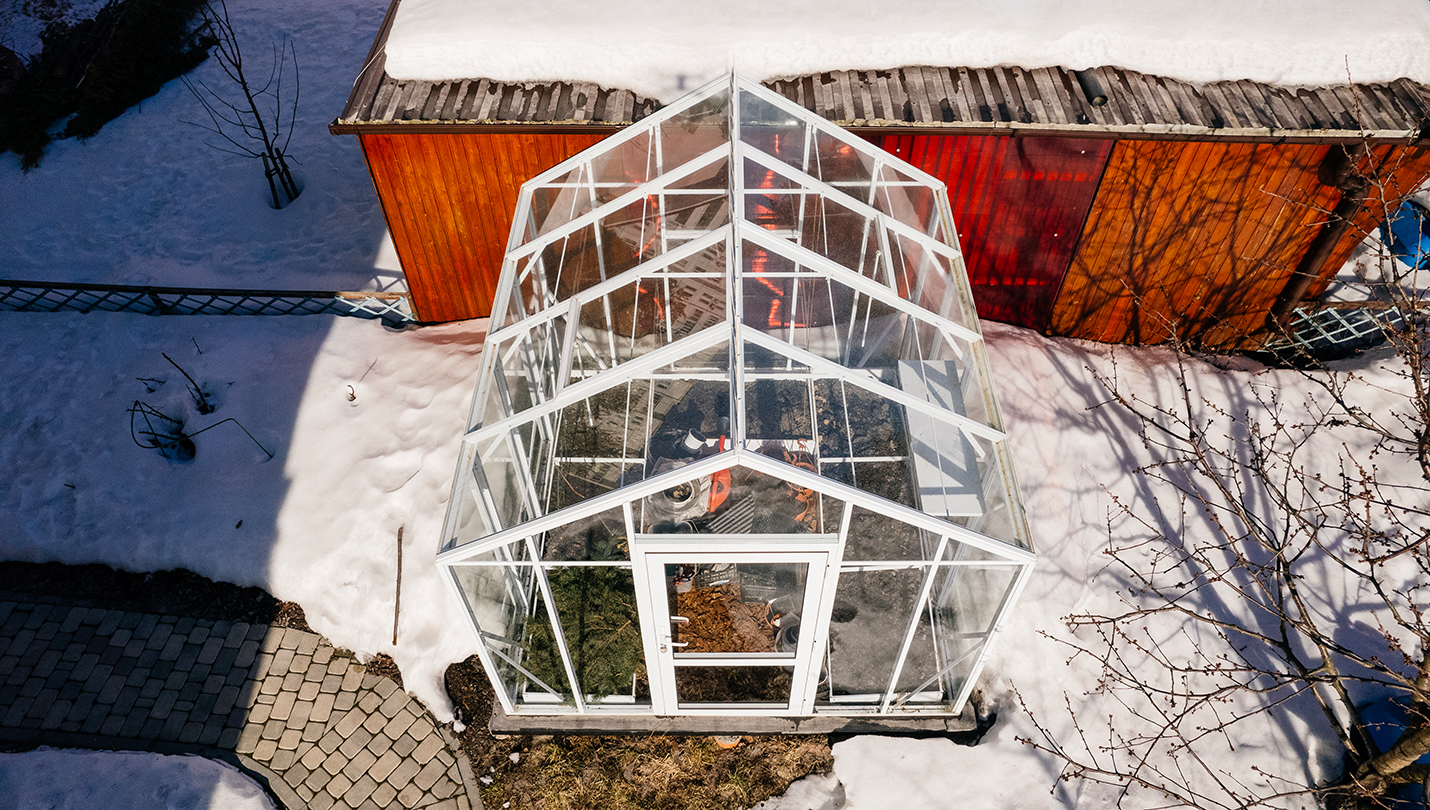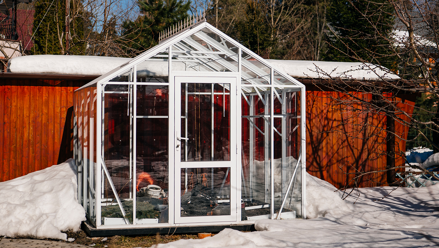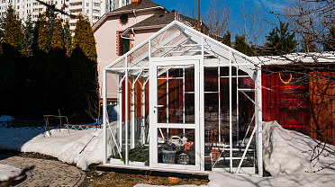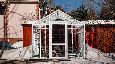 Теплица сохраняет выразительность и функциональность в любое время года. Летом она становится лёгким и открытым пространством, а зимой подчёркивает архитектуру участка, оставаясь надёжной и устойчивой в условиях снеговых нагрузок.