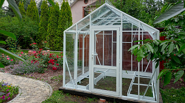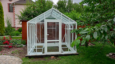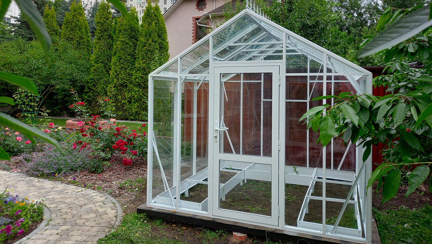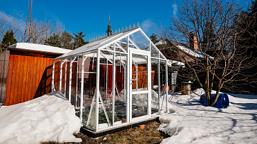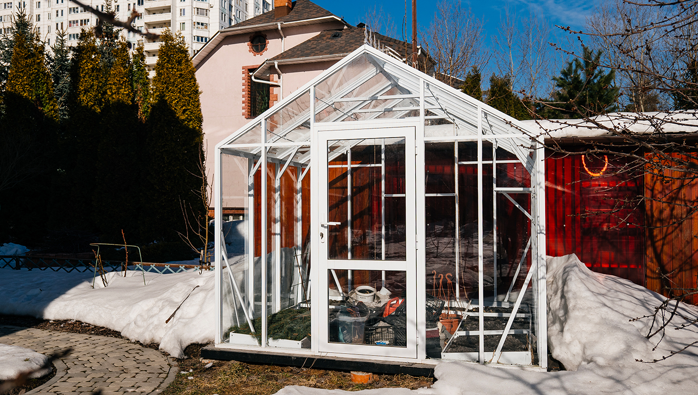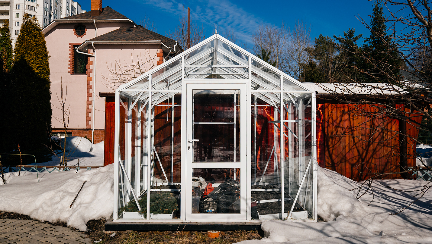 Теплица сохраняет выразительность и функциональность в любое время года. Летом она становится лёгким и открытым пространством, а зимой подчёркивает архитектуру участка, оставаясь надёжной и устойчивой в условиях снеговых нагрузок.